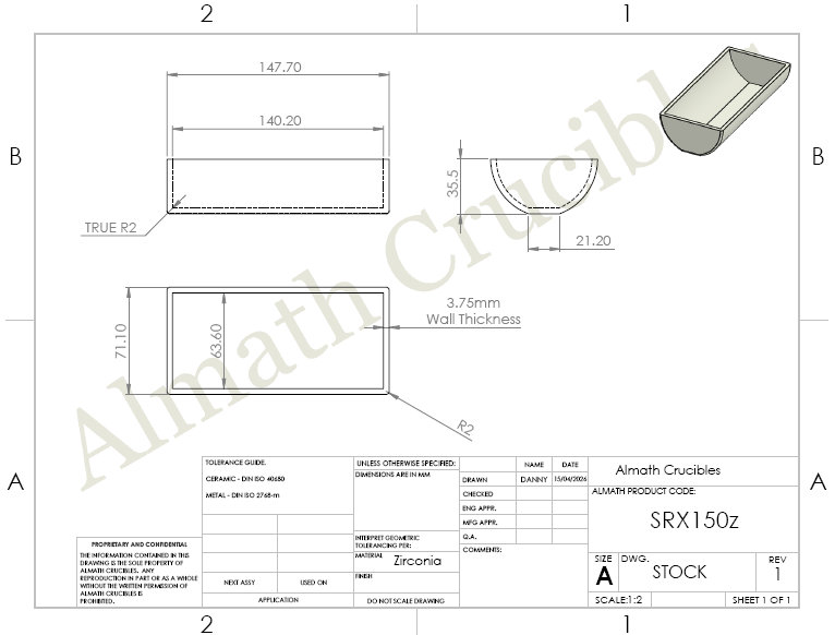 SRX150Z Round Bottom Boat Crucible. This product has a round bottom, curved sides. Made in Yttria Stabilised Zirconia.